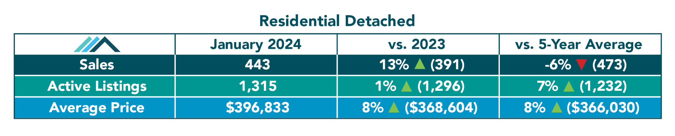 Interestingly, a close second was the $550,000-$599,999 price range which was just shy of 8% of all residential detached MLS® sales. There were 7 residential detached homes sold at $1 million or more in January 2024 whereas there were 3 sold in January 2023.