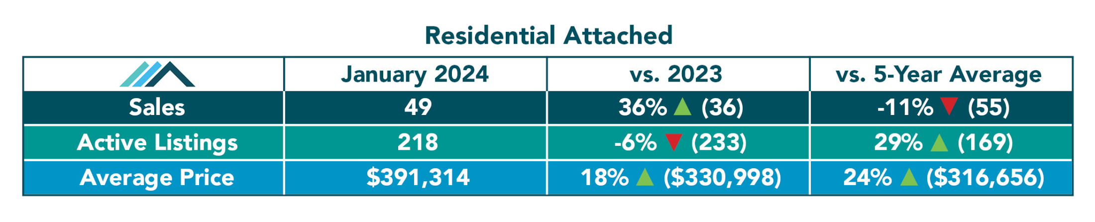 Of the 49 total MLS® residential attached home sales across the Winnipeg Regional Real Estate Board's market region in January, 38 were in Winnipeg and the remaining 11 occurred outside Winnipeg. Of the 218 active MLS® listings for residential attached homes, 129 were in Winnipeg and 89 were outside Winnipeg. The average price for a residential attached home was 18% above last January and 24% above the 5-year average.