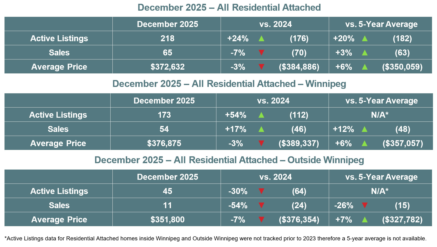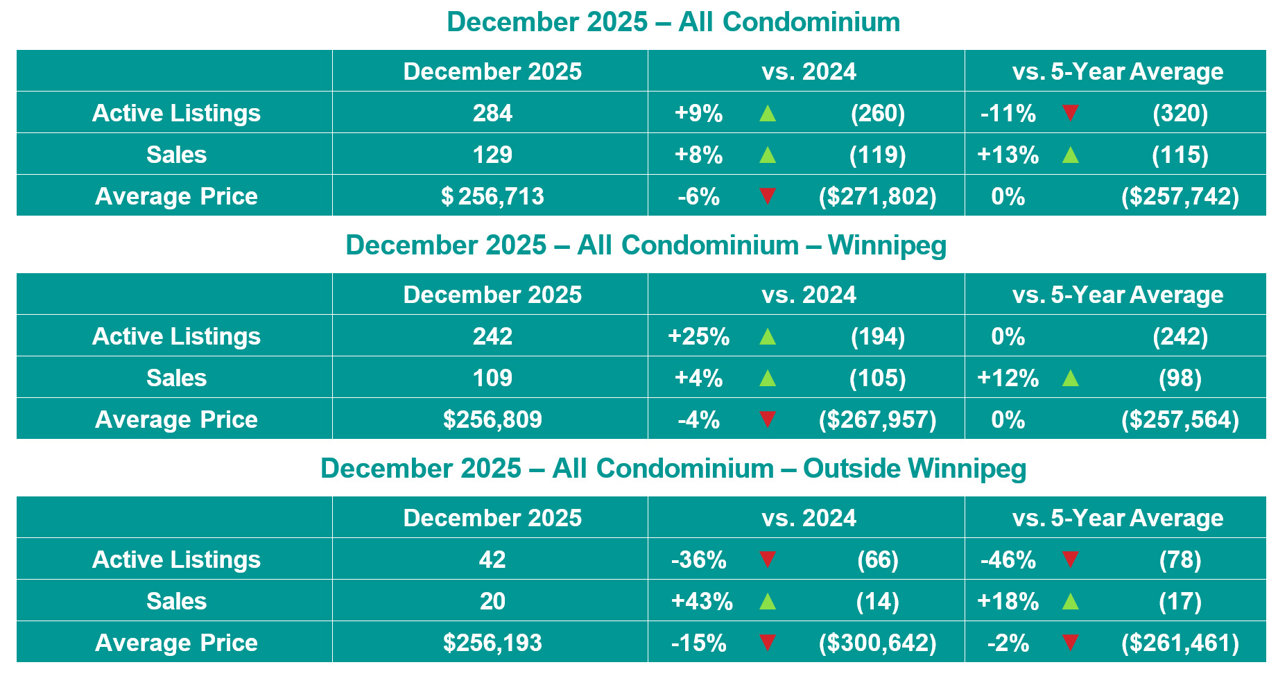Winnipeg, January 8, 2026 – All MLS®1 sales of 752 in December 2025 were up 2% from December 2024 and up 4% from the 5-year average. Active All MLS® listings of 2,292 were down 4% and total MLS® dollar volume of over $297 million was up 9% from December 2024. Residential detached MLS® sales of 466 were statistically even while the average price of $467,378 was up 10% when compared to last year. Condominium MLS® sales of 129 were up 8% and the average price of $256,713 was down 6% from December 2024.