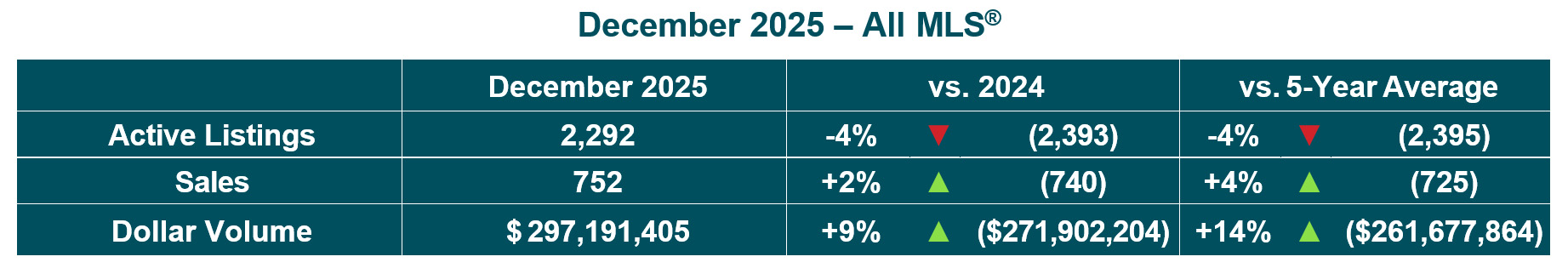 Year-to-date All MLS® sales of 15,180 through to the end of December 2025 were up 4%, total MLS® listings of 22,798 statistically even while total dollar volume of over $6B was up 10% from 2024. Year-to-date residential detached MLS® sales of 10,306 were up 3% and the average price of $451,852 was up 7% when compared to last December. Condominium MLS® sales of 2,199 were statistically even and the average price of $281,927 was 3% above last year.