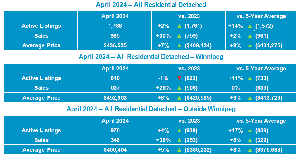 Winnipeg, May 8, 2024 – For April 2024, all MLS® sales reported by the Winnipeg Regional Real Estate Board were 1,419, an increase of 27% from March and 29% over last April. When comparing to April of 2023, all MLS® active listings of 3,827 were up 7% and total MLS® dollar volume of $561 million up 41%. The trend continued with residential detached MLS® sales of 985, up 30% while the average residential detached MLS® price of $436,535 was up 7% when compared to April 2023.