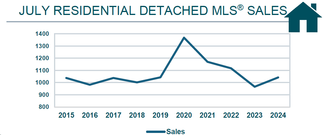 Winnipeg, August 9, 2024 – For the month of July, All MLS® sales reported by the Winnipeg Regional Real Estate Board of 1,488 were up 10% from last year, active MLS® listings of 4,173 down 3% and total MLS® dollar volume of $581 million up 16%. Residential detached MLS® sales of 1,042 were up 8% while the average price of $433,257 was up 7% when compared to last July. Condominium MLS® sales of 215 were up 8% and the average price of $284,151 up 12% over last July.
