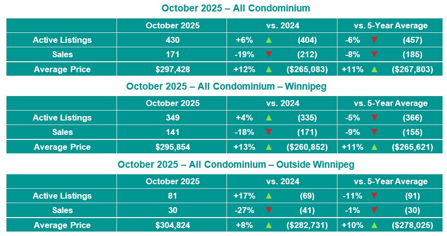 Winnipeg, November 6, 2025 – October 2025 saw All MLS® sales of 1,344 up 1% from October 2024 and up 6% from the 5-year average. Active MLS® listings of 3,519 were down 3% and total MLS® dollar volume of over $540 million up 7% from October 2024. Residential detached MLS® sales of 914 were down 1% while the average price of $442,104 was up 4% when compared to October 2024. Condominium MLS® sales of 171 were down 19% and the average price of $297,428 was up 12% from October 2024.