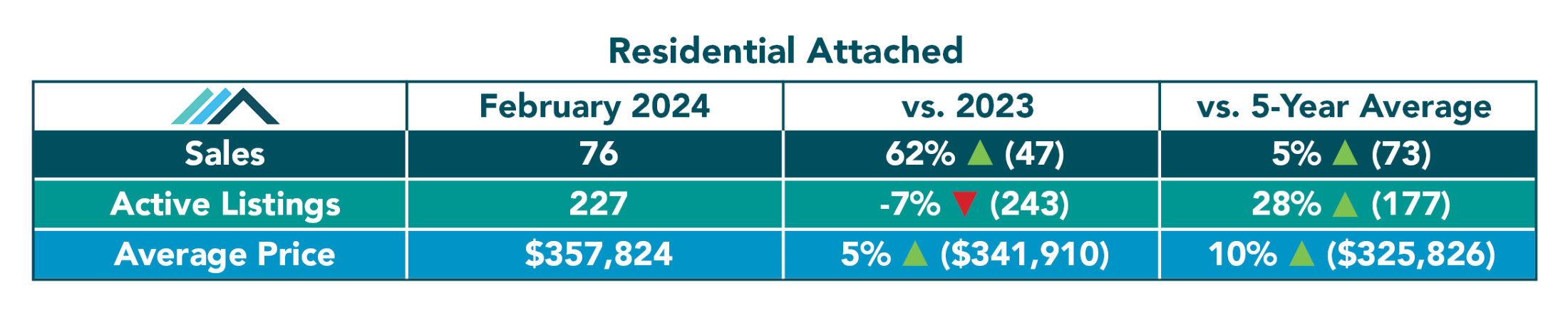Of the 76 total MLS® residential attached home sales across the Winnipeg Regional Real Estate Board's market region in February, 54 were in Winnipeg and the remaining 22 occurred outside Winnipeg. Of the 227 active MLS® listings for residential attached homes, 130 were in Winnipeg and 97 were outside Winnipeg. The average price for a residential attached home decreased 9% from January, increased 5% from last February, and is up 10% above the 5-year average.