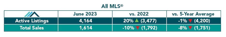 WINNIPEG, July 12, 2023 – MLS® sales in June rose slightly from last month while falling short of last June and the 5-year average. Active listings rose from last month and last June while coming to within 1 percentage point below the 5-year average.