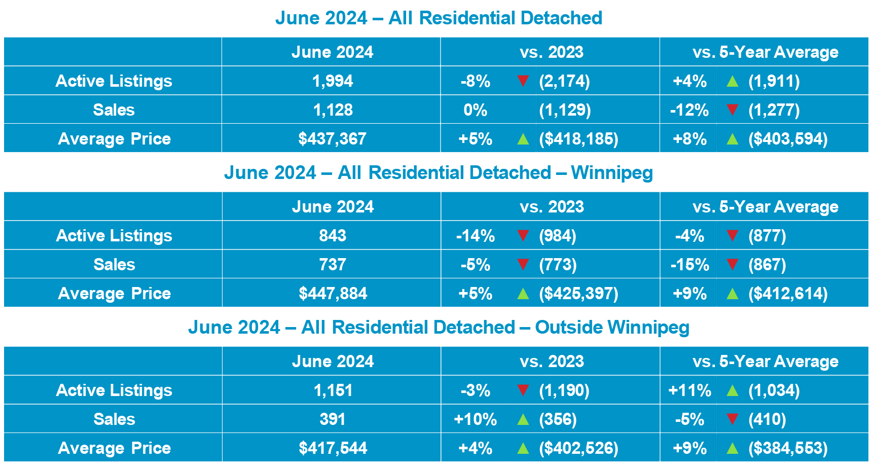 Winnipeg, July 9, 2024 – The first-half real estate market results for 2024 across the Winnipeg Regional Real Estate Board's market region saw All MLS® sales of 7,288 up 13% over 2023. MLS® listings of 12,399 were up 4% while dollar volume of $2.8B was up 20% over 2023. First-half 2024 residential detached MLS® sales of 4,979 were up 11% and the average price of $424,193 was up 6% when compared to last June. First-half 2024 condominium MLS® sales of 1,119 were up 13% and the average price of $277,252 was up 9% over last June while residential attached MLS® sales of 522 were up 15% and the average price of $365,719 up 9% over last year.