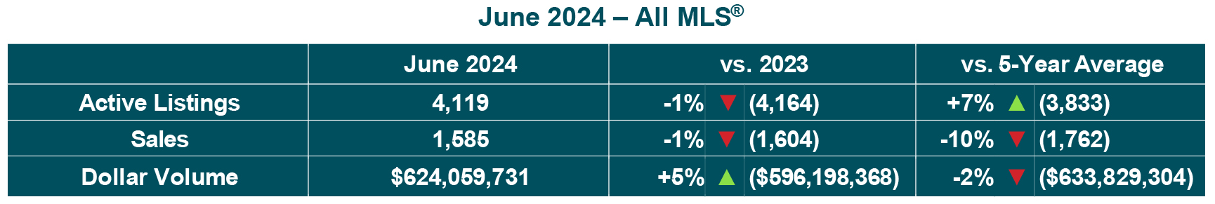 All MLS® sales for June 2024 were down 1% from last year to 1,585, active MLS® listings of 4,119 were up 1% and total MLS® dollar volume of $624 million was up 5%. Residential detached MLS® sales of 1,128 were statistically even while the average price of $437,367 was up 5% when compared to last June. Condominium MLS® sales of 209 were down 16% and the average price of $273,303 was up 6% over last June.