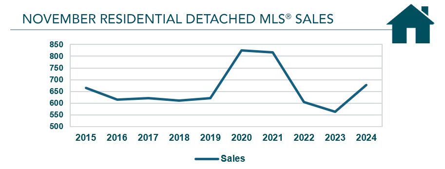 There were 14 residential detached homes sold at or above $1 million in November, with the highest price at just over $3.5 million. November 2023 had 5 residential detached homes sold at or above $1 million.