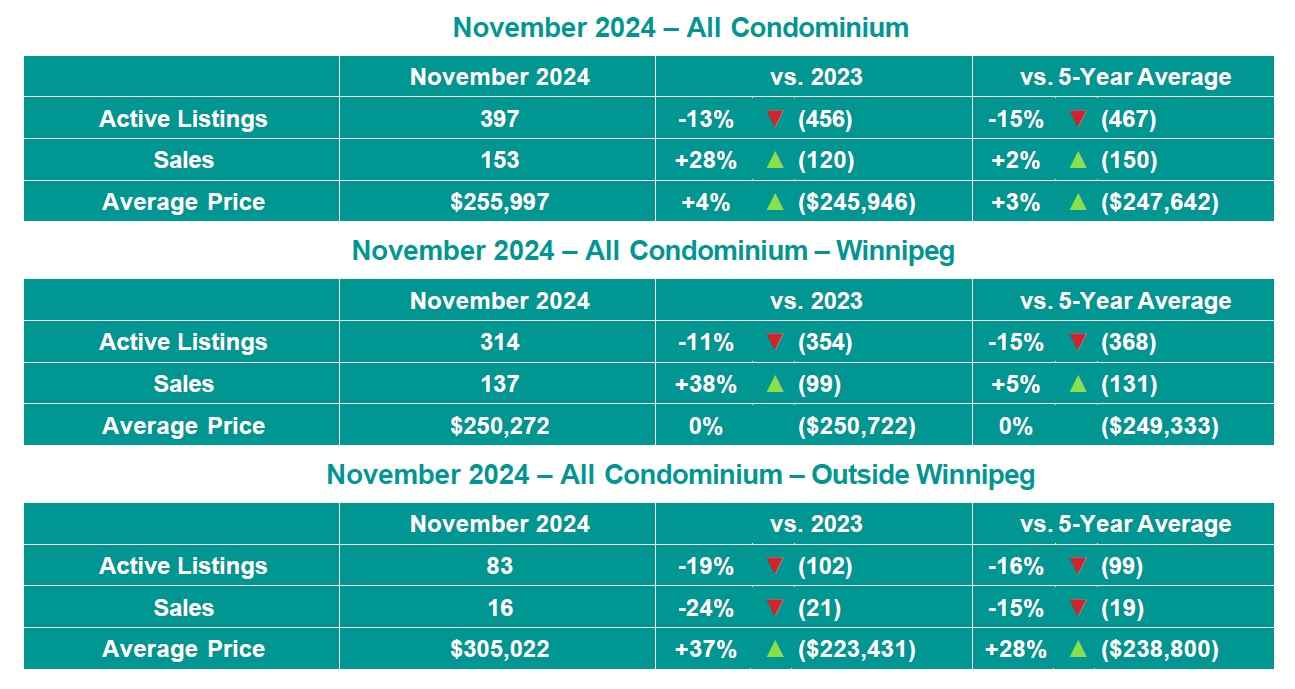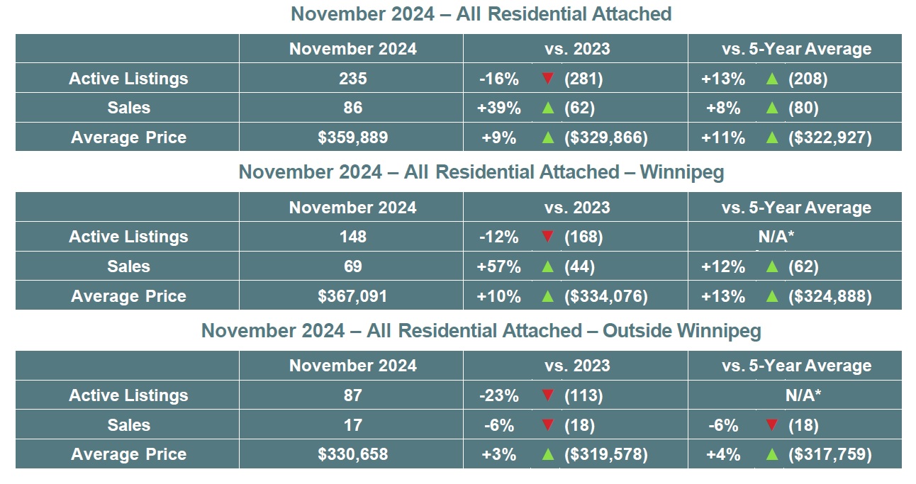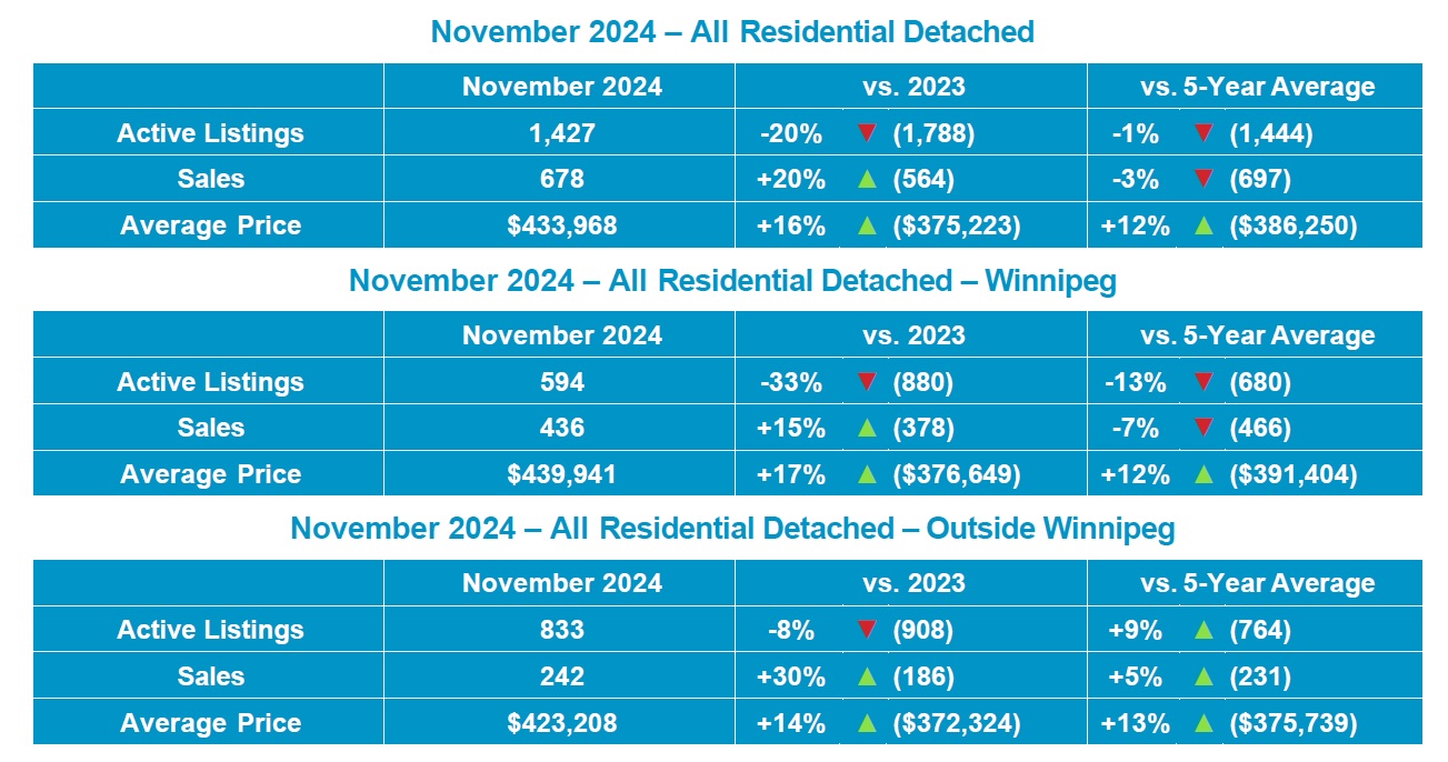 "For the first time in 2024, MLS® sales for the main three property types saw increases of at least 20% over 2023,” said Daphne Shepherd, 2024-2025 President of the Winnipeg Regional Real Estate Board. “November represents the seventh month in 2024, and second consecutive month, when there were double digit increases for total All MLS® sales for all property types. Average prices for the main three property types were higher than last year and the 5-year average. On a year-to-date basis, total MLS® sales, listings and dollar volume were all higher than last year and the 5-year average.”
