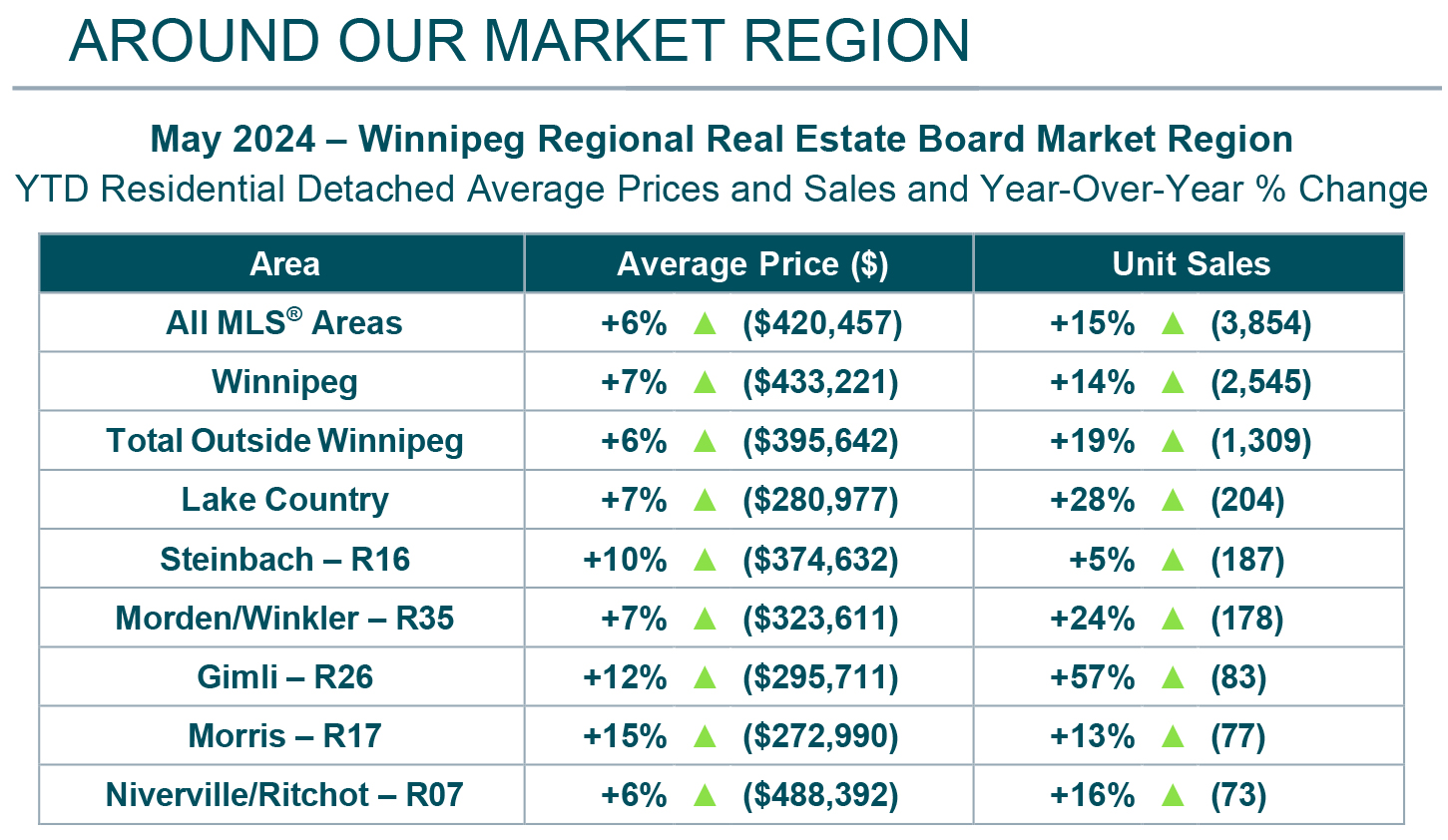 Winnipeg, June 11, 2024 – All MLS® sales reported by the Winnipeg Regional Real Estate Board for May 2024 were 1,726, an increase of 22% from April and 14% over last May. When comparing to May of 2023, active MLS® listings of 4,100 were up 1% and total MLS® dollar volume of $663 million up 18%. Residential detached MLS® sales of 1,189 were up 12% while the average price of $425,380 up 4% when compared to last May. Condominium MLS® sales of 279 were up 25% and the average price of $277,308 up 4% over last May. Residential attached MLS® sales of 123 were up 10% and the average price of $365,346 up 10% over last year.