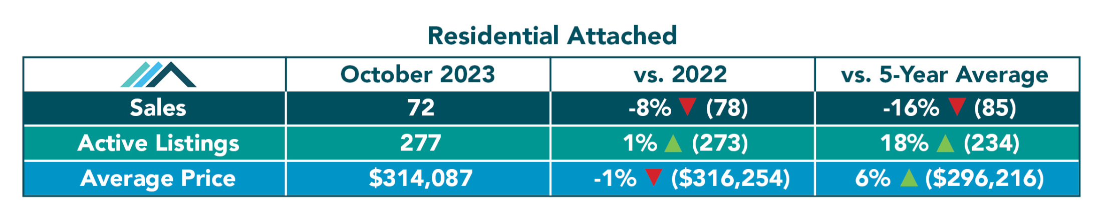 Of the 72 total MLS® residential attached home sales in October, 51 were in Winnipeg and the remaining 21 occurred outside Winnipeg. Of the 277 active MLS® listings for residential attached homes, 170 were in Winnipeg and 107 were outside Winnipeg. The average price for a residential attached home was 1% below last October and 6% higher than the 5-year average.