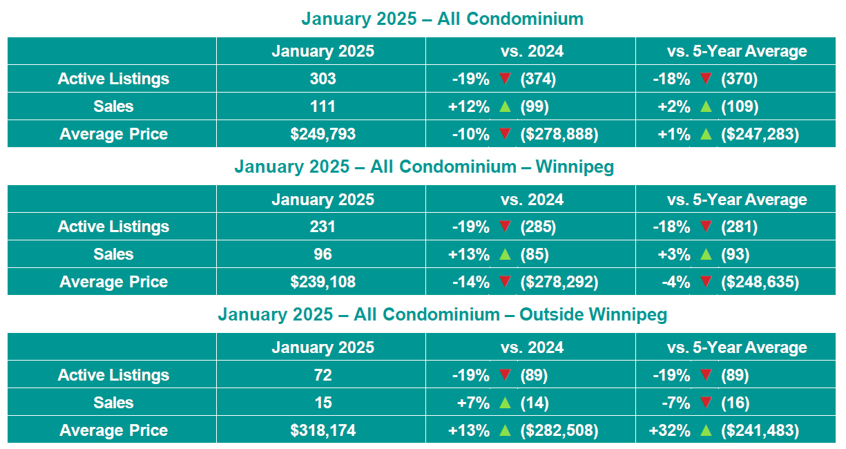 Winnipeg, February 7, 2025 – January saw All MLS® sales of 722 up 10% over January 2024, and 1% above the 5-year average. Active MLS® listings of 2,597 were down 14% from last January and total MLS® dollar volume of over $258 million up 9% from January 2024. Residential detached MLS® sales of 447 were up 1% while the average price of $413,247 was up 4% when compared to January 2024. Condominium MLS® sales of 111 were up 12% and the average price of $249,793 down 10% over last January.