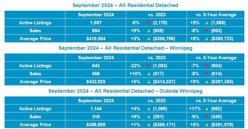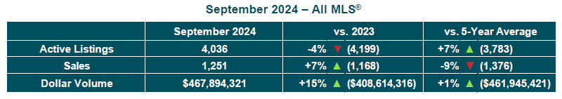 Winnipeg, October 8, 2024 – September saw All MLS® sales of 1,251 up 7% over last year, active MLS® listings of 4,036 down 4% and total MLS® dollar volume of over $467 million up 15%. Residential detached MLS® sales of 884 were up 9% while the average price of $410,004 was up 3% when compared to last September. Condominium MLS® sales of 174 were up 3% and the average price of $277,334 up 2% over last September.