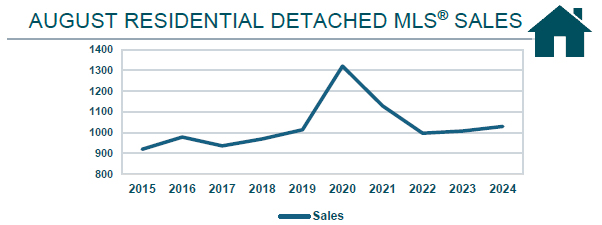 Year-to-date All MLS® sales of 10,250 were up 11%, total MLS® listings of 16,785 were up 3% while dollar volume of $3.9B was up 18% over 2023. Year-to-date residential detached MLS® sales of of 7,046 were up 9% and the average price of $424,164 was up 6% when compared to last August. Condominium MLS® sales of 1,542 were up 11% and the average price of $277,155 was up 7% over last August. Year-to-date residential attached MLS® sales of 716 were up 17% and the average price of $363,940 was up 9% over last year.