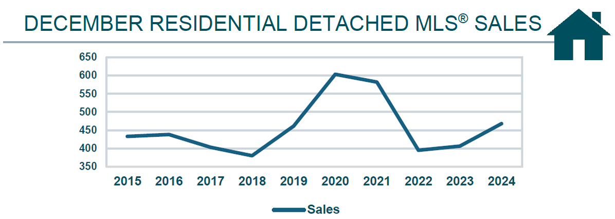 Year-to-date All MLS® sales of 14,597 were up 13%, total MLS® listings of 22,858 were up 2% while dollar volume of over $5.5B was up 20% over 2023. Year-to-date residential detached MLS® sales of 9,987 were up 11% and the average price of $423,878 was up 6% when compared to last December. Condominium MLS® sales of 2,194 were up 13% and the average price of $274,201 was up 6% over last December. Year-to-date residential attached MLS® sales of 1,039 were up 21% and the average price of $365,965 was up 10% over last year.