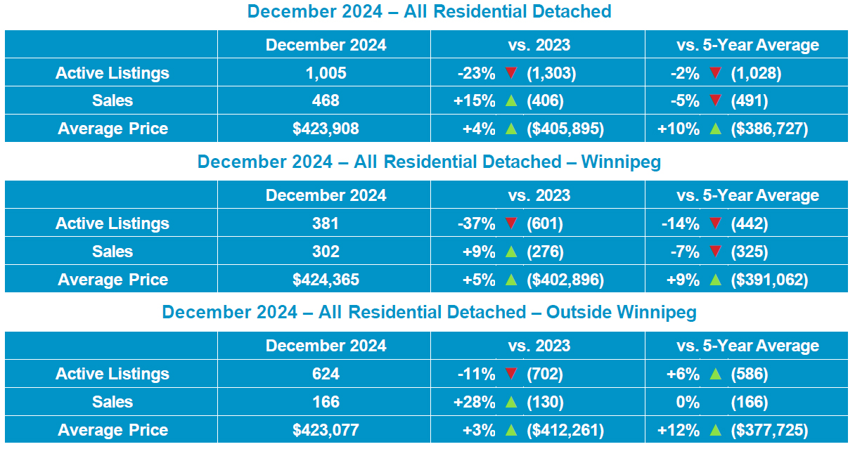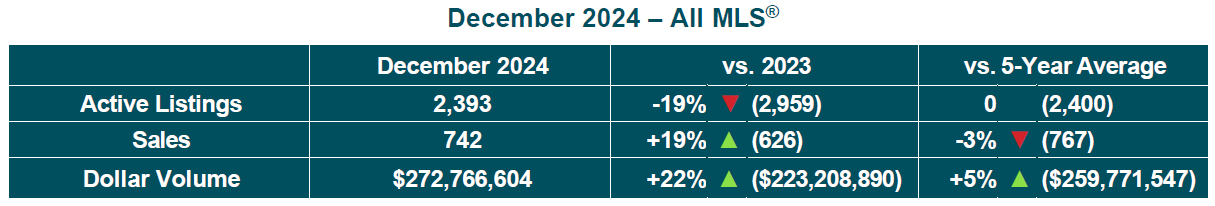 Winnipeg, January 9, 2025 – To close out 2024, December saw All MLS® sales of 742 up 19% over December 2023, and 3% lower than the 5-year average. Active MLS® listings of 2,393 were down 19% from last December and total MLS® dollar volume of over $272 million up 22% from December 2023. Residential detached MLS® sales of 468 were up 15% while the average price of $423,908 was up 4% when compared to December 2023. Condominium MLS® sales of 120 were up 18% and the average price of $272,728 up 1% over last December.