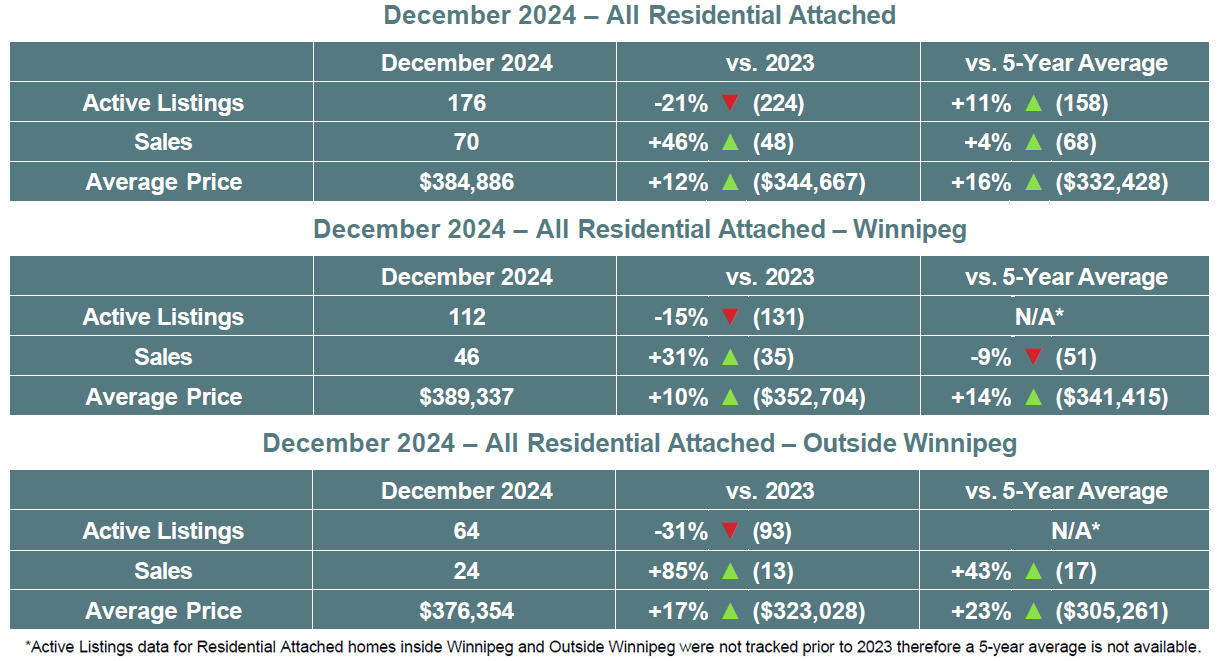"Similar to November, total December MLS® sales for all property types represented the third best December result on record," said Daphne Shepherd, 2024-2025 President of the Winnipeg Regional Real Estate Board. “December represents the eighth month in 2024, and third consecutive month, when there were double digit increases for total All MLS® sales for all property types. December MLS® sales, average prices and dollar volume for the main three property types were higher than last year while all but residential detached MLS® sales were higher than the 5-year average."