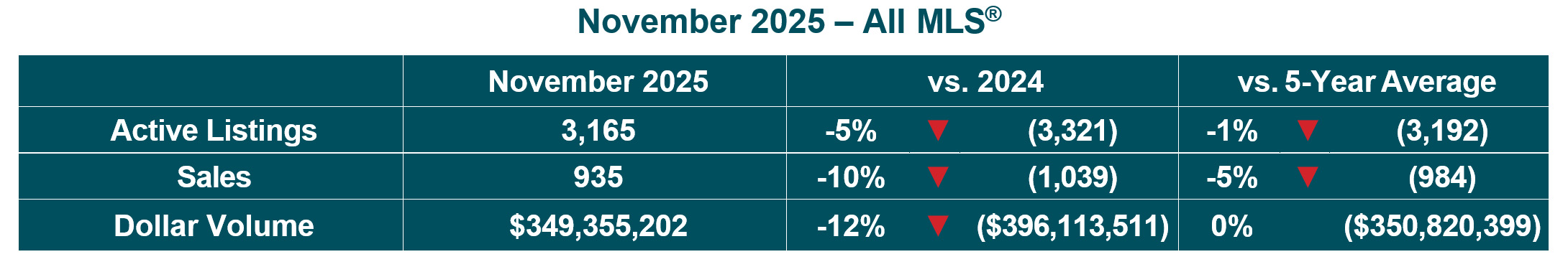 November 2025 saw All MLS® sales of 935 decrease 10% from November 2024 and were down 5%, active MLS® listings of 3,165 decreased 5% and total MLS® dollar volume of over $349 million was down 12% from November 2024. Residential detached MLS® sales of 630 decreased 7% while the average price of $420,121 was down 3% when compared to November 2024. Condominium MLS® sales of 129 were down 15% and the average price of $272,718 was up 6% from November 2024.