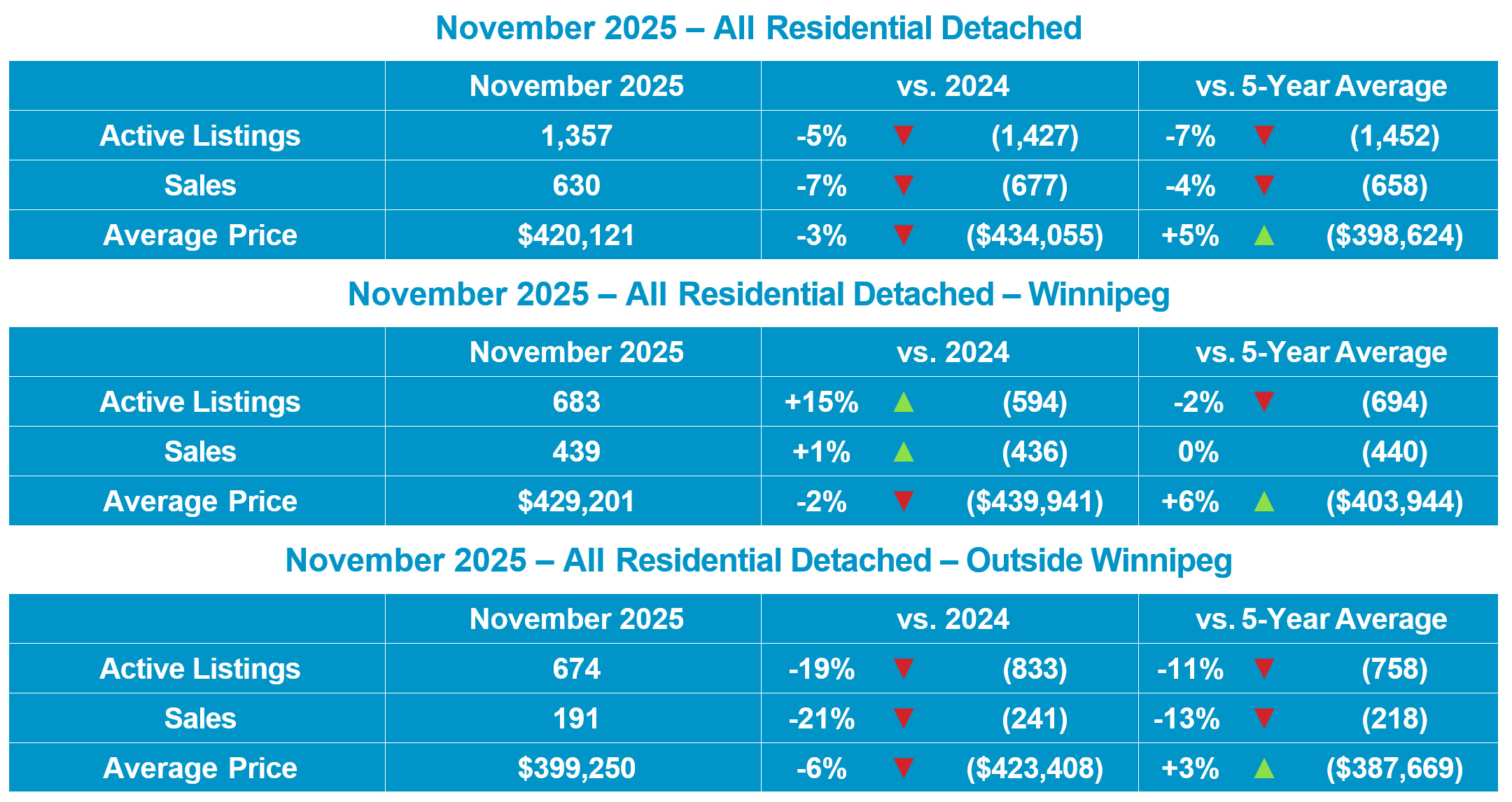 “Year-to-date All MLS® sales are the third highest on record and dollar volume is the second highest while residential detached and condominium prices set a new November record,” said Michael Froese, 2025-2026 President of the Winnipeg Regional Real Estate Board. “Condominium average prices rose versus last year and set a new November record while this is the first month in 2025 when residential detached average prices declined versus 2024 and did not set a monthly average price record. November’s real estate market saw declines in All MLS® sales and dollar volume while MLS® sales, dollar volume and average prices declined for residential detached homes.”